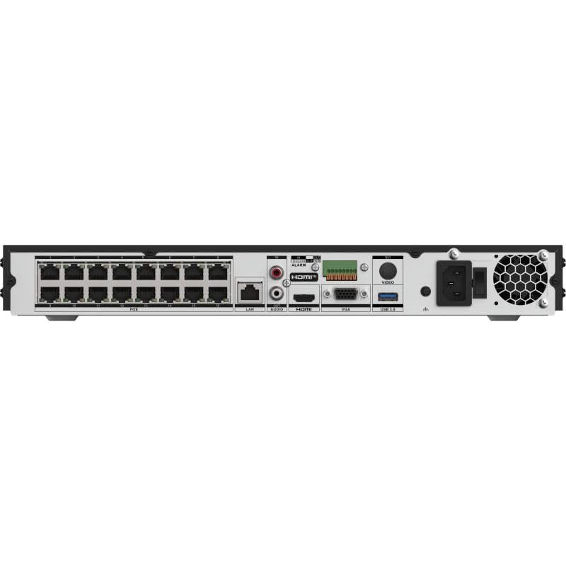 - 16 PoE-Ports (RJ-45), IEEE 802.3 af/at unterstützt für die Stromversorgung von IP-Kameras über den NVR